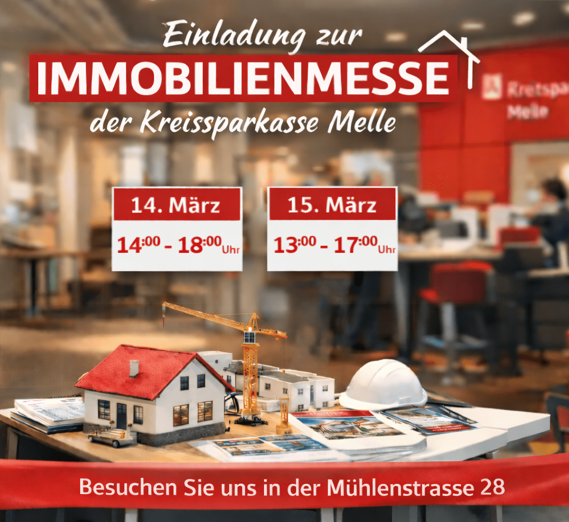 Wir laden Sie herzlich ein, uns auf der Immobilienmesse der Kreissparkasse Melle zu besuchen. Gemeinsam mit BPE und Middendorf Bau sind wir in diesem Jahr mit einem eigenen Stand vertreten und freuen uns darauf, mit Ihnen ins Gespräch zu kommen.